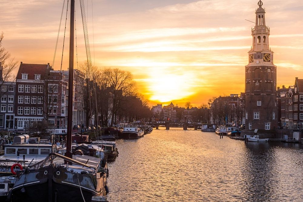Schiffe vor den Montelbaanstoren bei Sonnenuntergang in Amsterdam.