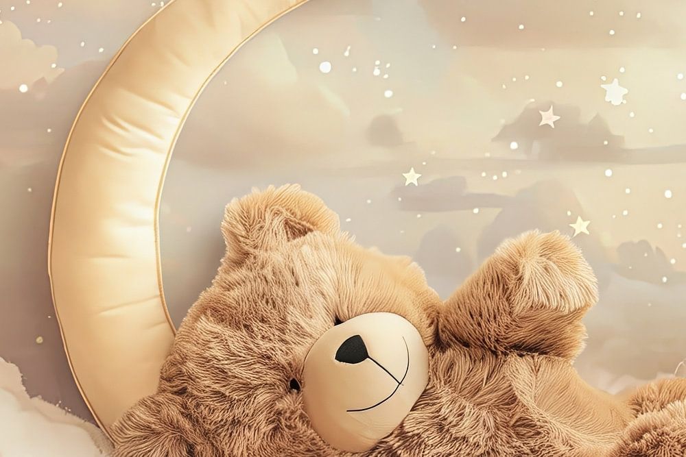 Dieses zauberhafte Wandbild zeigt einen plüschigen Teddybär, der friedlich auf weichen Wolken unter einem funkelnden Sternenhimmel schläft. Der sanfte, pastellfarbene Hintergrund schafft eine beruhigende und liebevolle Atmosphäre, ideal für Kinderzimmer oder Babyzimmer. Perfekt für Eltern, die eine warme und verträumte Umgebung für ihre Kleinen gestalten möchten. Ein liebevoller Akzent, der Kinder in eine Welt voller Geborgenheit und Träume entführt.