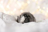Der liebe Wies liegt hier schlafend auf einem Bett mit süßen Lichtern im Hintergrund.