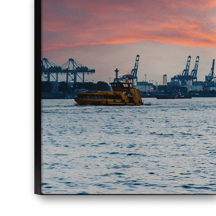 Schlepper auf der Elbe im Hafen Hamburg bei Abenddämmerung mit Wolken und Ladekränen