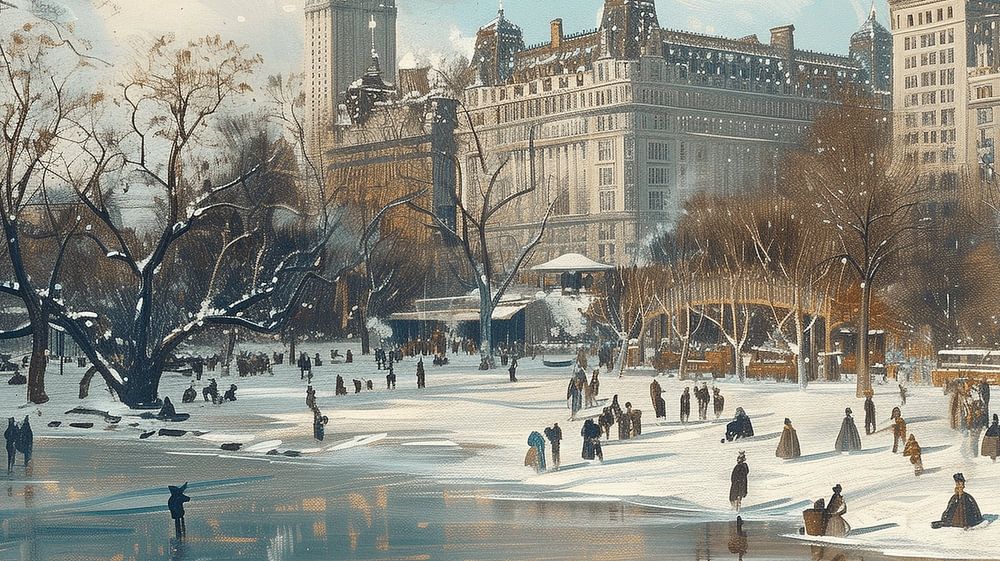 Ein Gemälde eines Parks in New York um 1900, weiß mit Schnee und das Wasser mit Eis gefroren. Die Menschen flanieren und erholen sich im Park in der Nähe der Restaurants und im Schnee. Einige wenige wagen sich auf das noch dünne Eis. Hinter den Bäumen sind große, klassische Gebäude zu sehen. Luxuriöse Hotels und opulente Penthäuser mit Blick auf den Park. Das Bild atmet den Hauch vergangener Tage mit strengen Wintern, dicken Schneepaketen und unschuldiger Romantik in einer geschäftigen und schnelllebigen Stadt.