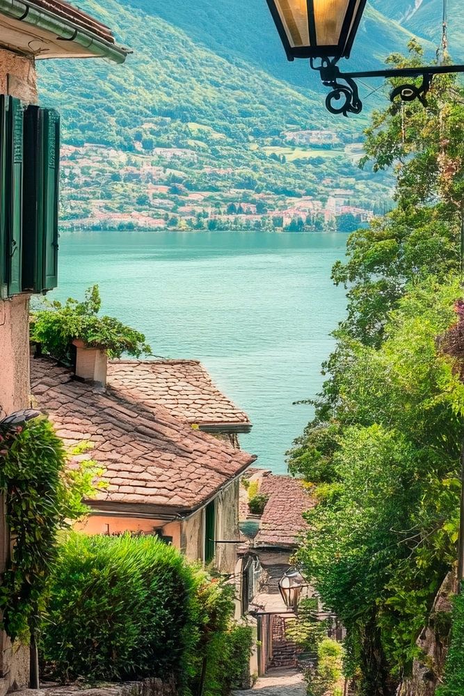Ein von üppigem Grün gesäumter Kopfsteinpflasterweg schlängelt sich zwischen malerischen Häusern mit bunten Fensterläden. Eine antike Laterne wirft warmes Licht auf die Szenerie, während der Blick über den glitzernden See und majestätische Berge schweift. Diese verträumte Gasse scheint Geschichten aus einer anderen Zeit zu flüstern und lädt zum Entdecken ein.