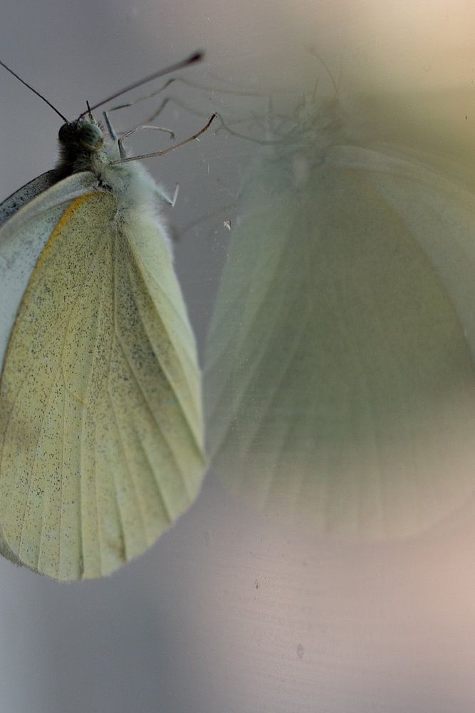 Eine Makroaufnahme eines Schmetterlings, der auf einem Fenster sitzt. Es gibt ein schönes Spiegelbild, so dass man den Schmetterling zweimal sieht. Im Hintergrund sehen Sie ein schönes Bokeh. Der Schmetterling ist ein weißer