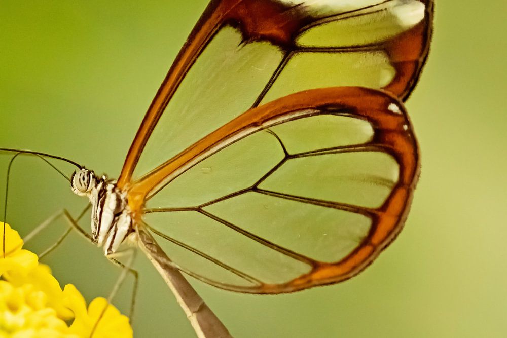 Der schöne und eindrucksvolle Glasschmetterling saß ruhig auf der gelben Blume, für mich die ideale Gelegenheit, ein schönes Foto von ihm zu machen.