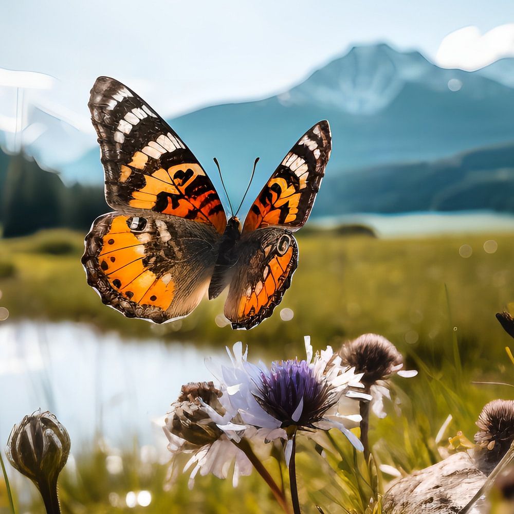 Dieses beeindruckende Bild zeigt einen wunderschönen Schmetterling, der elegant über einer idyllischen Berglandschaft schwebt. Im Hintergrund erstreckt sich eine sanft geschwungene grüne Wiese, die von bunten Blumen und duftenden Kräutern gesäumt wird. Inmitten der Wiese befindet sich ein kleines, glitzerndes Gewässer, das sich wie ein Spiegel zeigt und die umliegende Pracht perfekt reflektiert. Die majestätischen Berge rahmen die Szenerie ein und erheben sich stolz in den strahlend blauen Himmel.