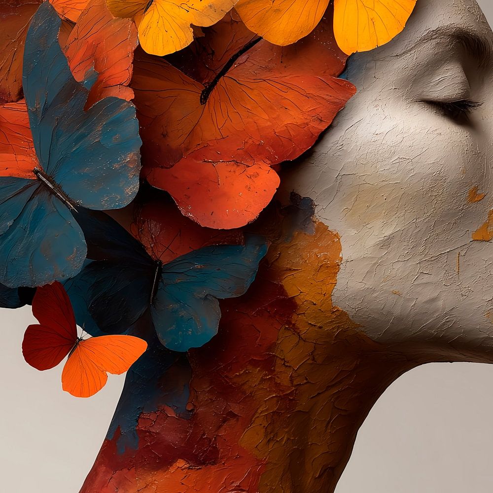 Büste einer Frau mit heiterem Gesichtsausdruck, verziert mit einer lebhaften Komposition von Schmetterlingen auf ihrem Kopf. Die Büste hat eine künstlerische, strukturierte Oberfläche mit abstrakten Farbflächen. Der Hintergrund ist in gedämpftem Beige gehalten, das die leuchtenden Farben und die komplizierten Details der Schmetterlinge und des Bildes hervorhebt.