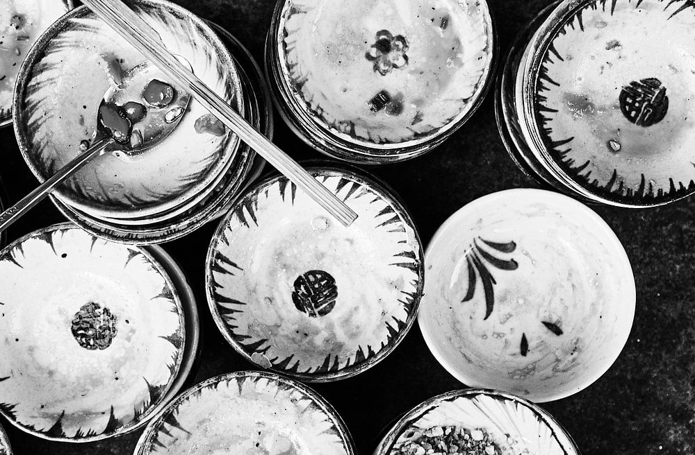Auf einer Stufe vor einem Restaurant in Vietnam wartet schmutziges Geschirr darauf, gewaschen zu werden