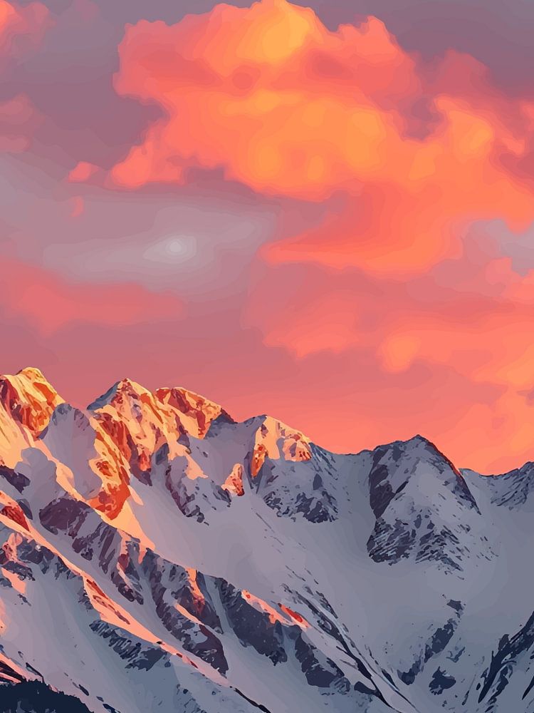 Ein dramatisches Foto von schneebedeckten Bergen, die in das warme, goldene Licht eines Sonnenauf- oder -untergangs getaucht sind und einen atemberaubenden Himmel bilden.