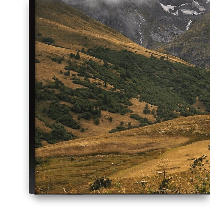 Ein Blick über eine Almwiese auf ein Paar verschneiter Berggipfel, die teilweise hinter tief hängenden Wolken verborgen sind. Das Foto wurde während einer Fahrt auf der Route des Grandes Alpes in Frankreich aufgenommen. Die Sonne, die gelegentlich die Wolkendecke durchbricht, lässt die ausgedörrte Almwiese im Vordergrund goldgelb…