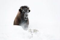 American Bison / Amerikanischer Bison ( Bison bison ) in winter, breaking through a little hill of deep fluffy snow, frontal shot, Yellowstone National Park, Wyoming, USA.