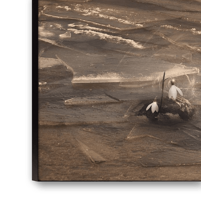 Engel, der auf dem Eis liegt und die Schneeglöckchen beobachtet, die aus dem Eis herauswachsen