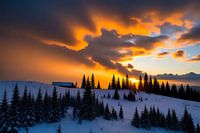 Das Foto zeigt eine atemberaubende, verschneite Winterlandschaft im warmen Schein eines dramatischen Sonnenuntergangs und verbindet kühle Klarheit mit samtenem Farbenzauber. Die unberührten Felder und sanft geschwungenen Hügel sind unter einer makellosen Schneedecke verborgen, die das Licht der sinkenden Sonne zu feinem Gold und zartem…