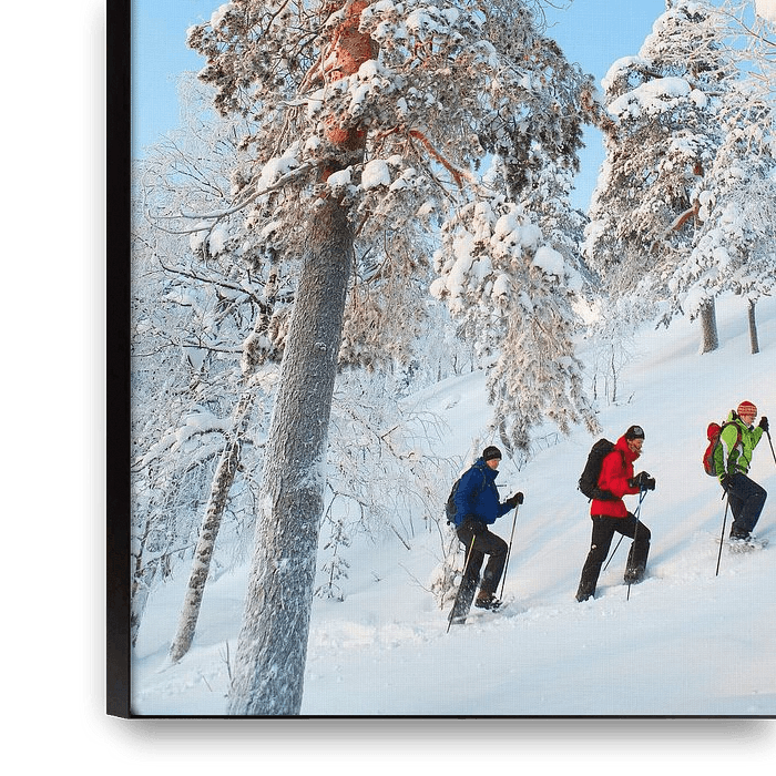 Bestelle dieses Landschafts-Wandbild Schneeschuhwandern in Finnland von Menno Boermans als Reproduktion auf Leinwand, Alu-Dibond, als Poster, Fototapete oder Acrylglasbild.