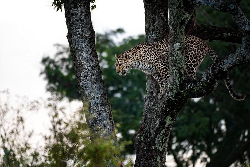 Bild eines Leoparden im Baum - bereit zum Sprung. Sehr konzentriert. Die Seitenansicht des Leoparden zeigt sehr schön den ganzen Körper.