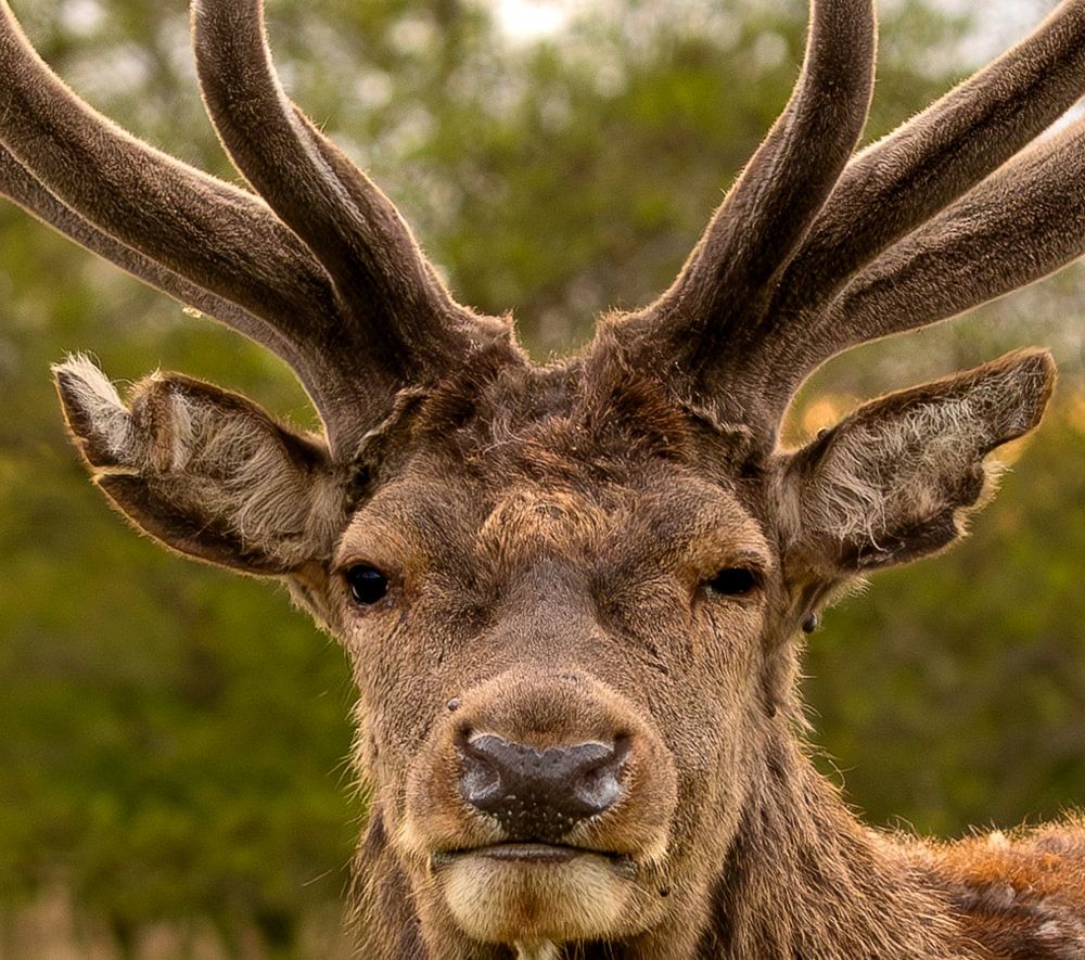 sein neues Geweih wächst kräftig, Sonnenuntergang auf den oostvaardersplassen.