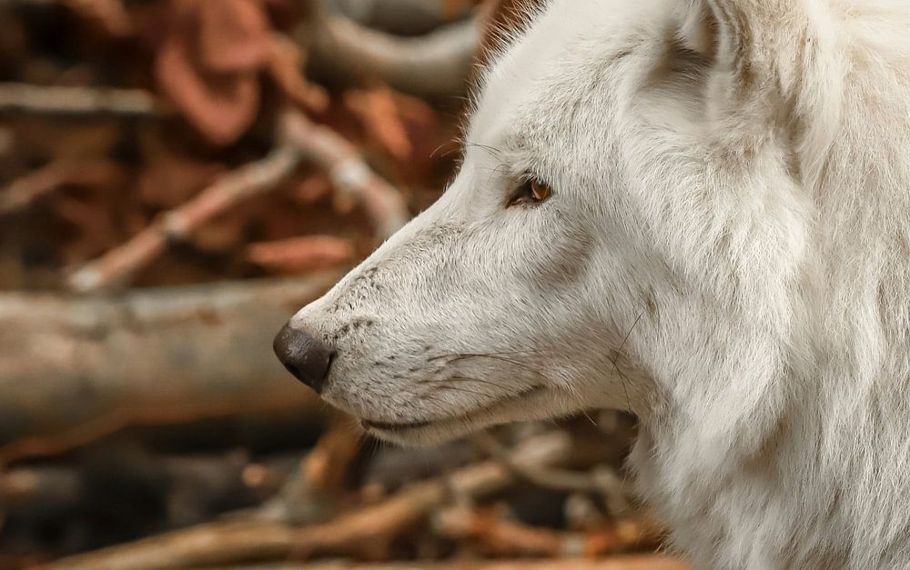 Dieses Bild zeigt das Porträt eines weißen Hudson Bay Wolfs vor einem natürlichen Hintergrund.
