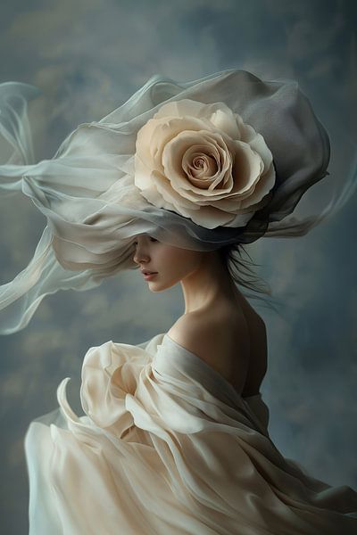 Ein ätherisches Porträt, in dem seidige Stoffe und eine üppige Rose zu einer verträumten Komposition verschmelzen. Die sanften, cremigen Weißtöne und fließenden Bewegungen schaffen eine zeitlose Eleganz, während die dramatische Beleuchtung und die raffinierten Details eine Atmosphäre von Geheimnis und Romantik hervorrufen.