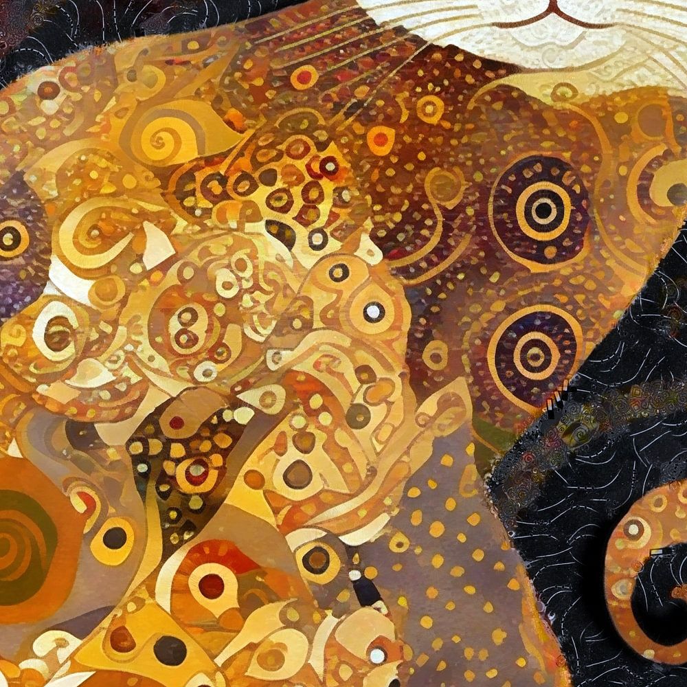 Abstraktes Porträt einer schönen bunten Katze im Stil der Malerei von Gustav Klimt mit Goldtönen.