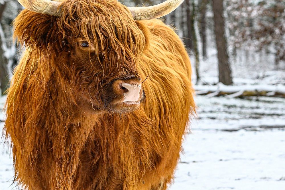 Porträt eines schottischen Hochlandrindes im Schnee während des Winters. Die schottischen Hochlandrinder werden beim Naturschutz in der Veluwe eingesetzt, um sicherzustellen, dass die Heideflächen nicht zu dicht wachsen.