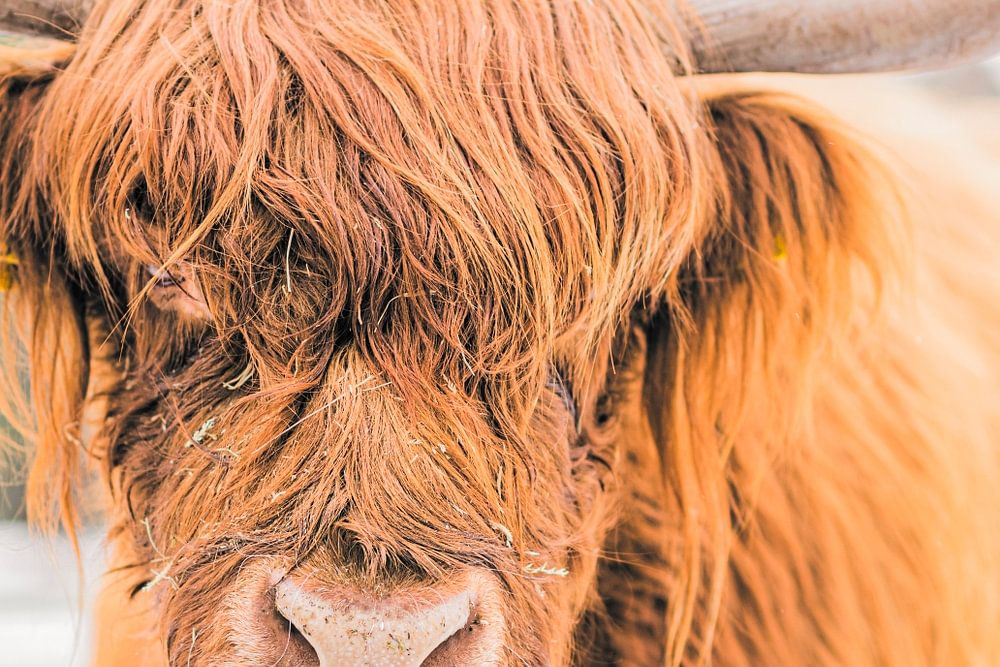 Porträt eines schottischen Hochlandrindes im Schnee an einem kalten Wintertag in einem Wald. Die schottischen Hochlandrinder werden beim Naturschutz in der Veluwe eingesetzt, um sicherzustellen, dass die Heideflächen nicht zu dicht wachsen.