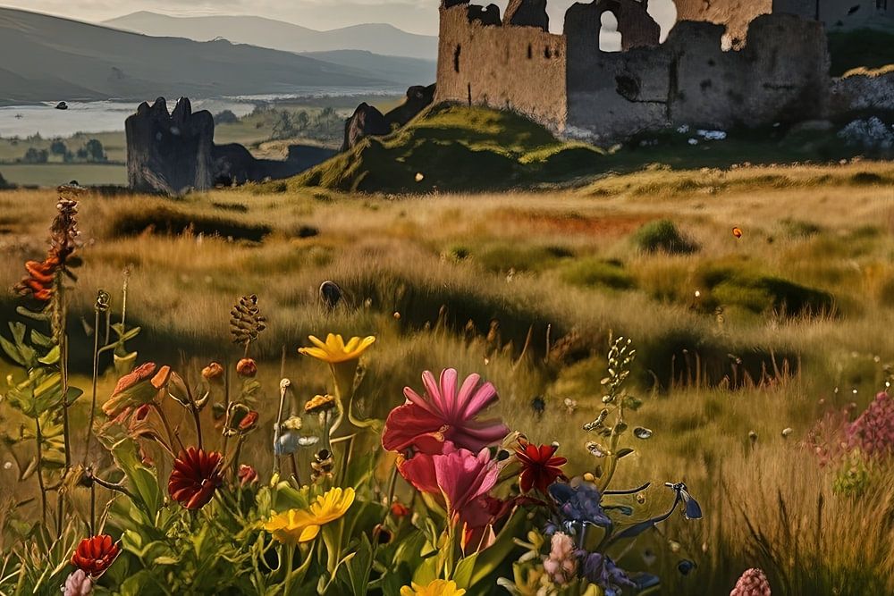Die schottischen Highlands mit Burgen, Ruinen, Wildblumen, sanften Hügeln und Bergen. Diese raue Landschaft regt die Fantasie vieler Menschen an! Diese mit AI erstellten Bilder vermitteln einen schönen Eindruck davon, was wir uns unter Schottland vorstellen.