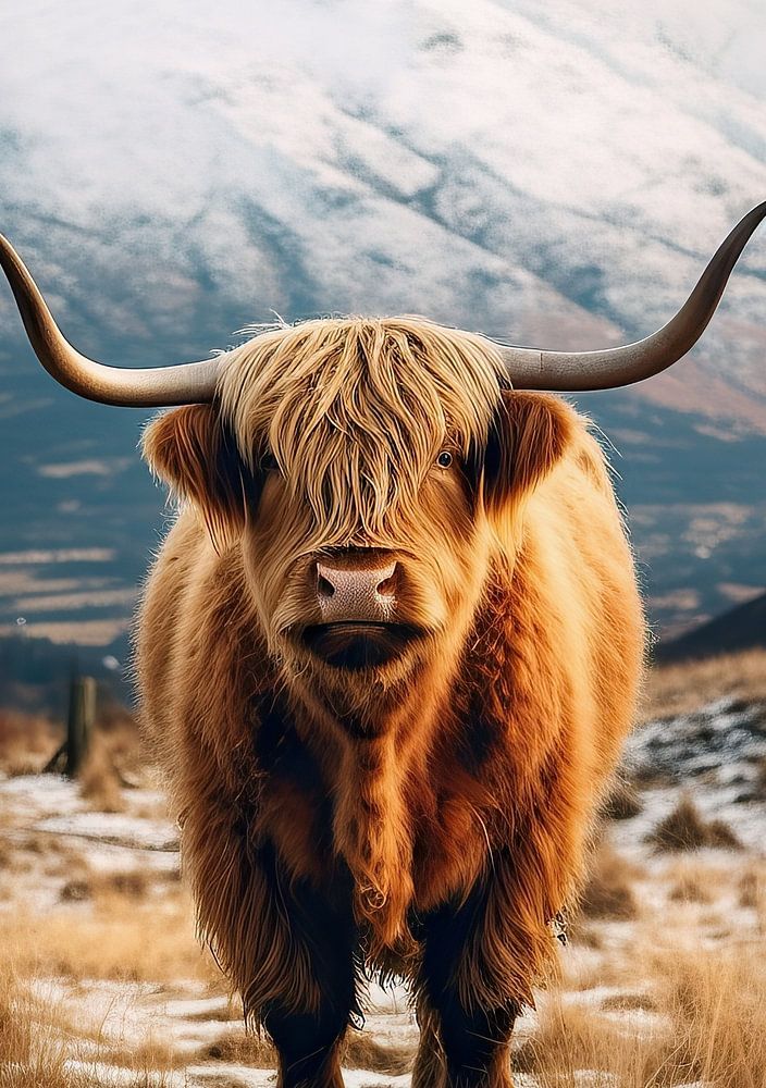 Eine majestätische Hochlandkuh, die vor den schneebedeckten Bergen steht, mit ihrem dichten Fell und den langen Hörnern, die ihre wilde Schönheit unterstreichen.