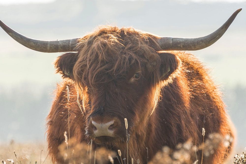 Ein schottischer Highlander an einem sonnigen Herbsttag im Naturschutzgebiet Huis ter Heide in der Provinz Nordbrabant in den Niederlanden. Das Naturschutzgebiet wird von Natuurmonumenten verwaltet.