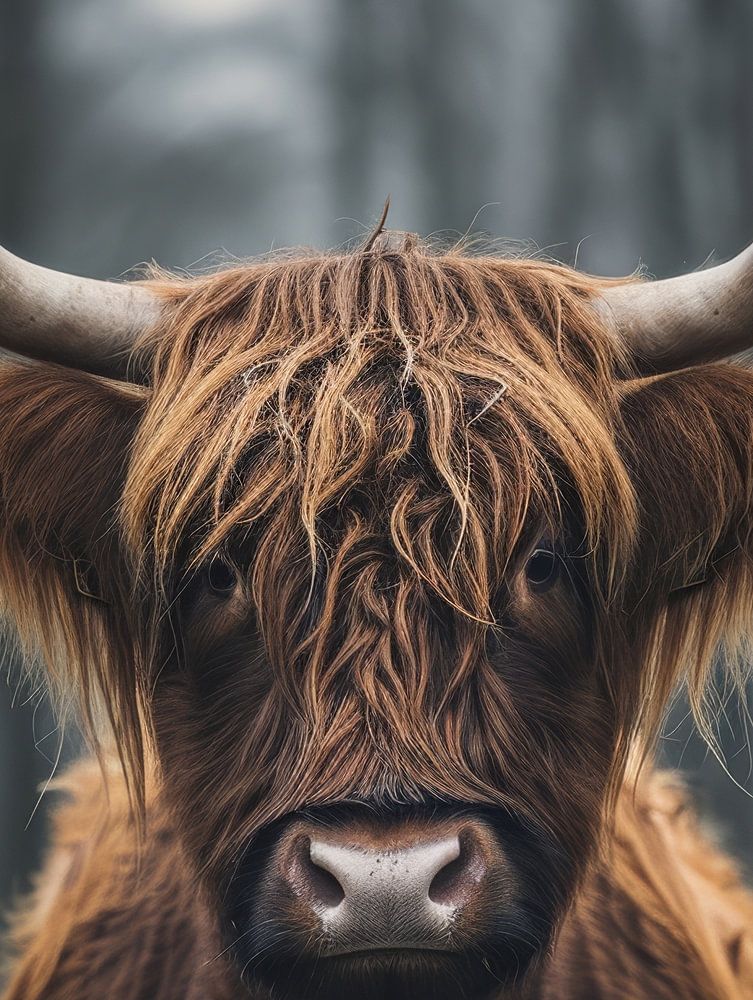Dieses bezaubernde Porträt eines schottischen Highlanders, fotografiert in einem nebligen Wald, strahlt Ruhe und Geheimnis aus. Die dunklen, gedämpften Töne des Hintergrunds schaffen eine stimmungsvolle Kulisse, während das rötlich-braune Fell des Highlanders warm und einladend wirkt. Die Hörner ragen stolz in die Höhe und verleihen dem Bild ein Gefühl von Stärke und Gelassenheit. Dieses Kunstwerk ist ideal für Liebhaber von natürlicher Schönheit und geheimnisvollen, ruhigen Landschaften.