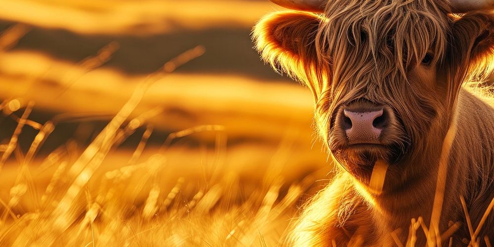 Die letzten Sonnenstrahlen des Tages beleuchten die markanten Hörner und das weiche Fell des Highlanders und schaffen eine malerische Szene, die sowohl beeindruckend als auch herzerwärmend ist.