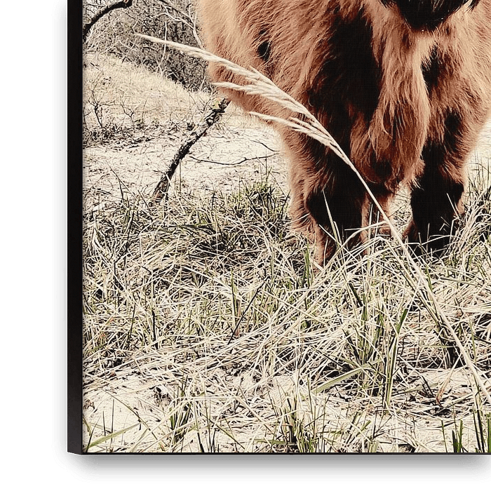 Bestelle dieses Schottische Hochlandrind Wandbild Schottischer Highlander in den Dünen von Beachlines and colors SdK als Reproduktion auf Leinwand, Alu-Dibond, als Poster, Fototapete oder Acrylglasbild.