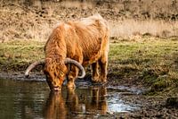 Die imposanten Hörner des schottischen Highlanders sind beim Trinken von Wasser aus einem Teich deutlich zu sehen.