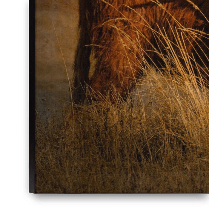 Eine schottische Hochlandkuh in einem schönen Naturschutzgebiet in den Niederlanden. Eine Rinderrasse, die mit ihrem langen, rotbraunen Haar und den großen Hörnern so beeindruckend anzusehen ist. (Dem Bild wurde eine Textur hinzugefügt).