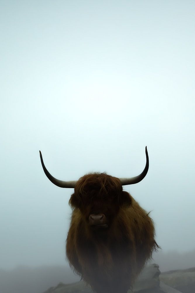 Schottischer Highlander in einer nebligen Dünenlandschaft.