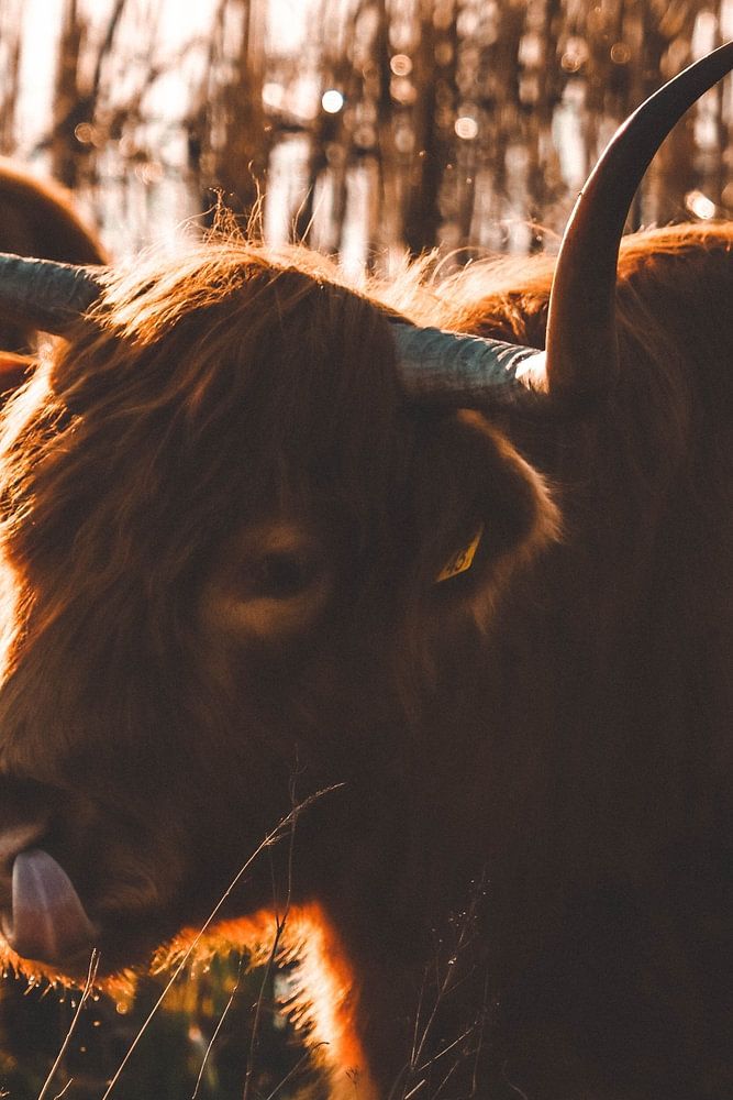 Das Foto dieses fotogenen schottischen Highlanders wurde an einem sonnigen Frühlingstag im Erholungsgebiet Twiske in der Nähe von Amsterdam aufgenommen. Schottische Highlander sind friedliche Tiere und können fast überall in den Niederlanden gefunden werden. Das Licht schien wunderschön auf sein Gesicht und es war ein schöner Moment während der goldenen Stunde.