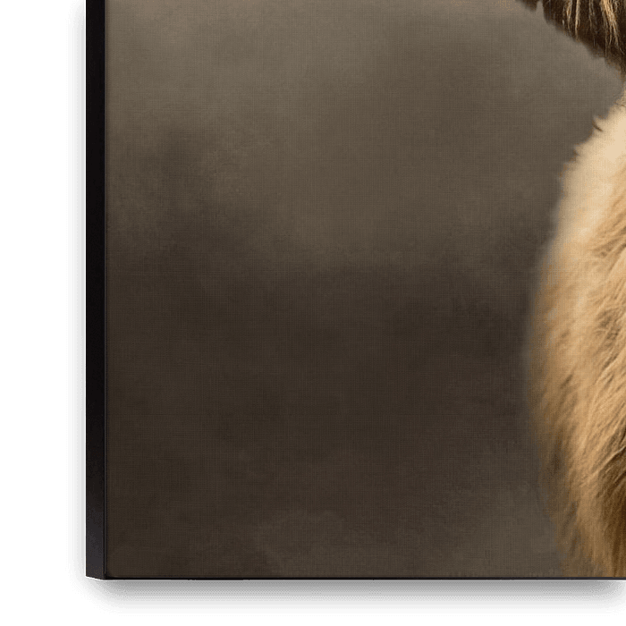 Porträt eines schottischen Hochlandbewohners. Das Foto dieses berührenden großen Weidegängers wurde auf einem wunderschön gemalten Hintergrund in warmen braunen und bräunlich-grünen Farben digital bearbeitet.