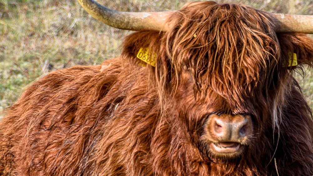Junger schottischer Highlander. Er liegt so ruhig da und grübelt, die Haare vor den Augen, und schaut mich etwas verschlafen an. Es scheint ihn nicht zu interessieren, was ich tue. Doch ich sehe, dass er mich mit seinen Augen verfolgt. Ich gehe nicht näher heran, denn dann störe ich seine Ruhe und seinen Frieden.