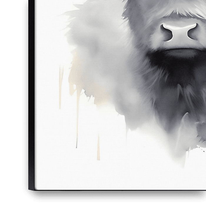 Scottish highlander calf for nursery' ist eine Schwarz-Weiß-Zeichnung eines schottischen Highlander-Kalbs. Es wurden Aquarellfarben und weiche Farben verwendet.