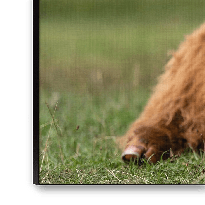 Schottisches Highlander-Kalb liegt im Gras. Der orangerote Mantel bildet einen schönen Kontrast zu dem grünen Gras und den dunklen Bäumen in der Ferne.