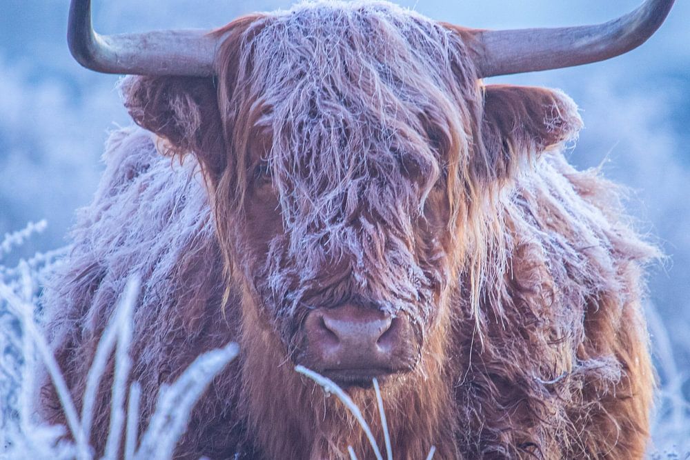 Ein schöner Morgen mit Frost auf dem Gras UND dem Highlander, ein schönes Bild.