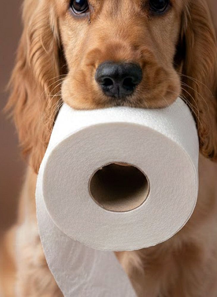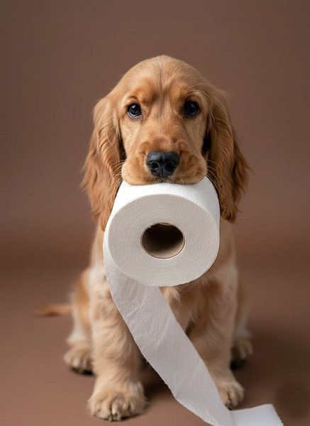 Eine bezaubernde Nahaufnahme eines jungen Spaniels mit einer Toilettenpapierrolle im Maul. Seine großen, dunklen Augen blicken direkt in die Kamera – eine Mischung aus Unschuld, Neugier und vielleicht ein bisschen Unfug.