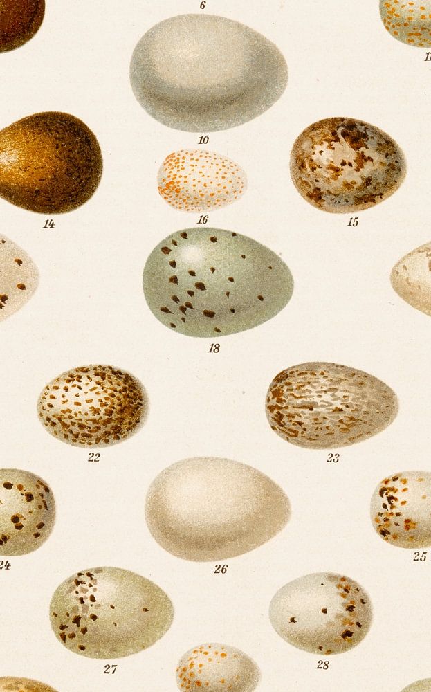 Farbtafel aus der Zeit um 1900 mit 34 Eiern europäischer Singvögel. Wir sehen unter anderem die Eier von Nachtigall, Rotkehlchen, Goldammer, Kohlmeise, Star und Gimpel. Eigentlich die am häufigsten vorkommenden Vögel.