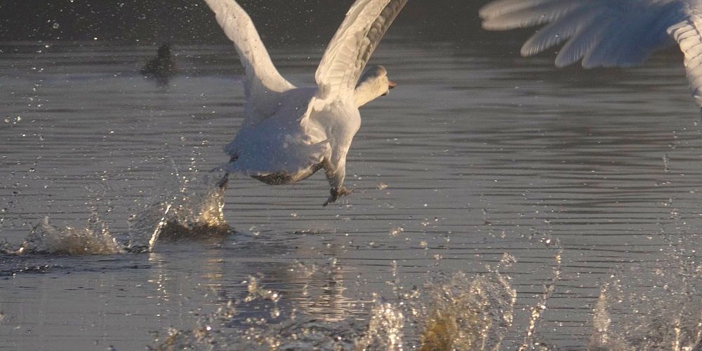 An einem schönen Dezembermorgen mit tiefstehender Sonne beschließen zwei Schwäne, mit viel Geschrei und Geflatter abzuheben.