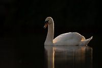Ein Schwan in ruhigem Wasser, in dem es wenig Licht gibt, vermittelt eine sehr ruhige Atmosphäre. Der Lichtrand um den Umriss des Schwans vervollständigt das Bild. Das Weiß des Schwans hebt sich wunderbar vom dunklen Hintergrund ab.
