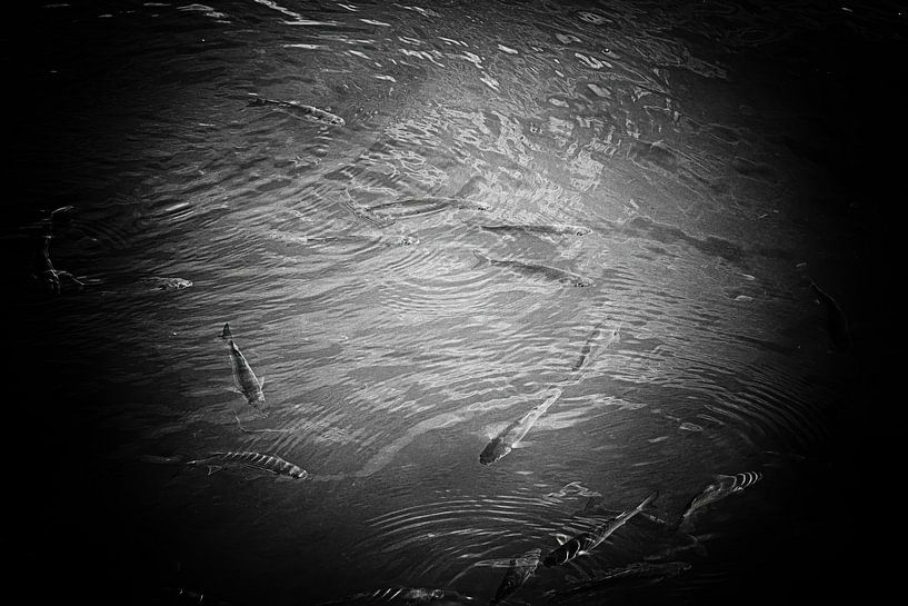 Über „Schwarm von Streifenbarschen im Wasser (schwarz-weiß)“ von Fotografie Jeronimo