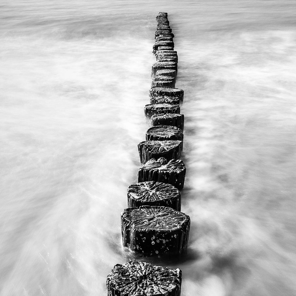 Schwarz-Weiß-Aufnahme von Pfosten mit der Bewegung von Wasser