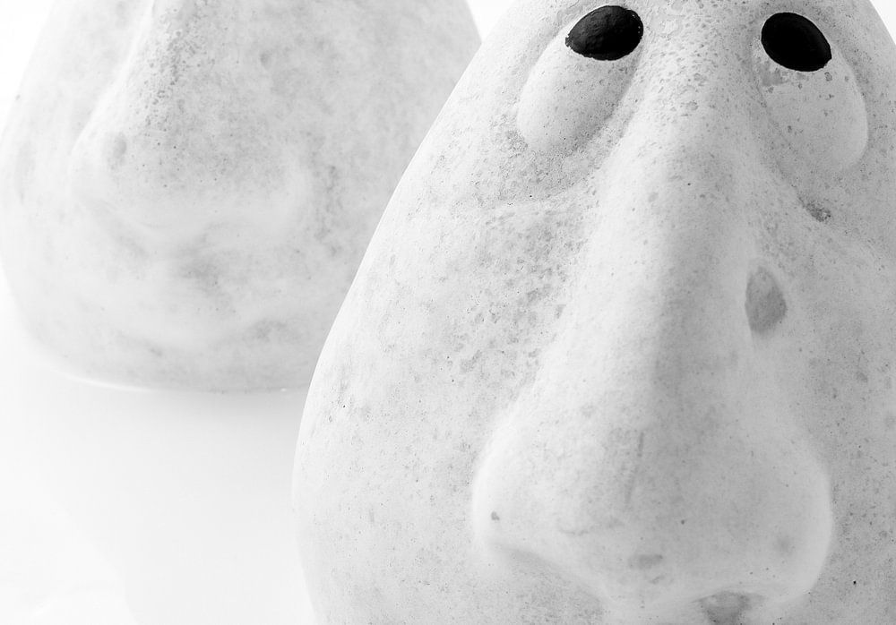 Künstlerisches Schwarz-Weiß-Foto von zwei charakteristischen Keramikköpfen, die in einem weißen See stehen.