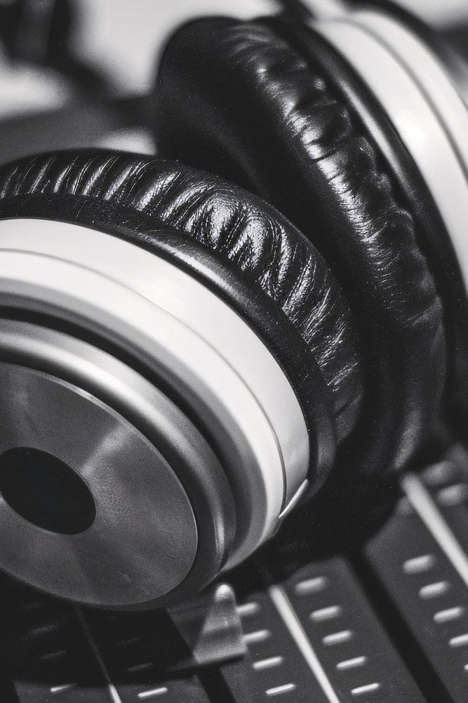 Tauchen Sie ein in die Welt des Klangs mit diesem künstlerischen Schwarz-Weiß-Bild eines professionellen Kopfhörers, der auf einem Mischpult ruht. Das schlichte, minimalistische Design stellt das Wesentliche der Musikproduktion in den Mittelpunkt. Eine perfekte Ergänzung für jeden Musikliebhaber oder jedes Studio.