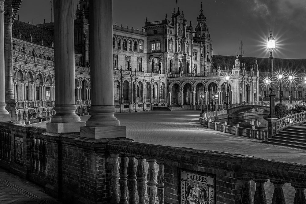 Die Plaza de Espana in Sevilla in aller Herrgottsfrühe. Das Licht ist noch an, es ist dunkel, es ist noch niemand da.