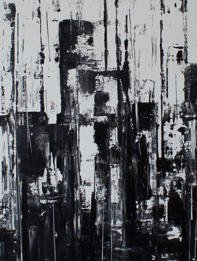 Dieses Gemälde vermittelt das Gefühl, als blicke man auf eine Stadt, die langsam aus dem Nebel auftaucht. Die Farben verlaufen von tiefem, fast tintenschwarzem Schwarz am unteren Rand zu strahlendem Weiß am oberen Rand. Am unteren Rand des Gemäldes befindet sich das tiefe Schwarz, das ich mit großer Kraft aufgetragen habe, fast so, als…