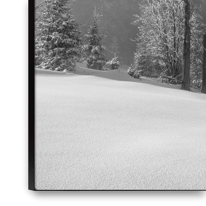 Schwarz-weiß Tannen im Nebel bei frischem Schnee im Tannheimer Tal auf dem Schönkahler